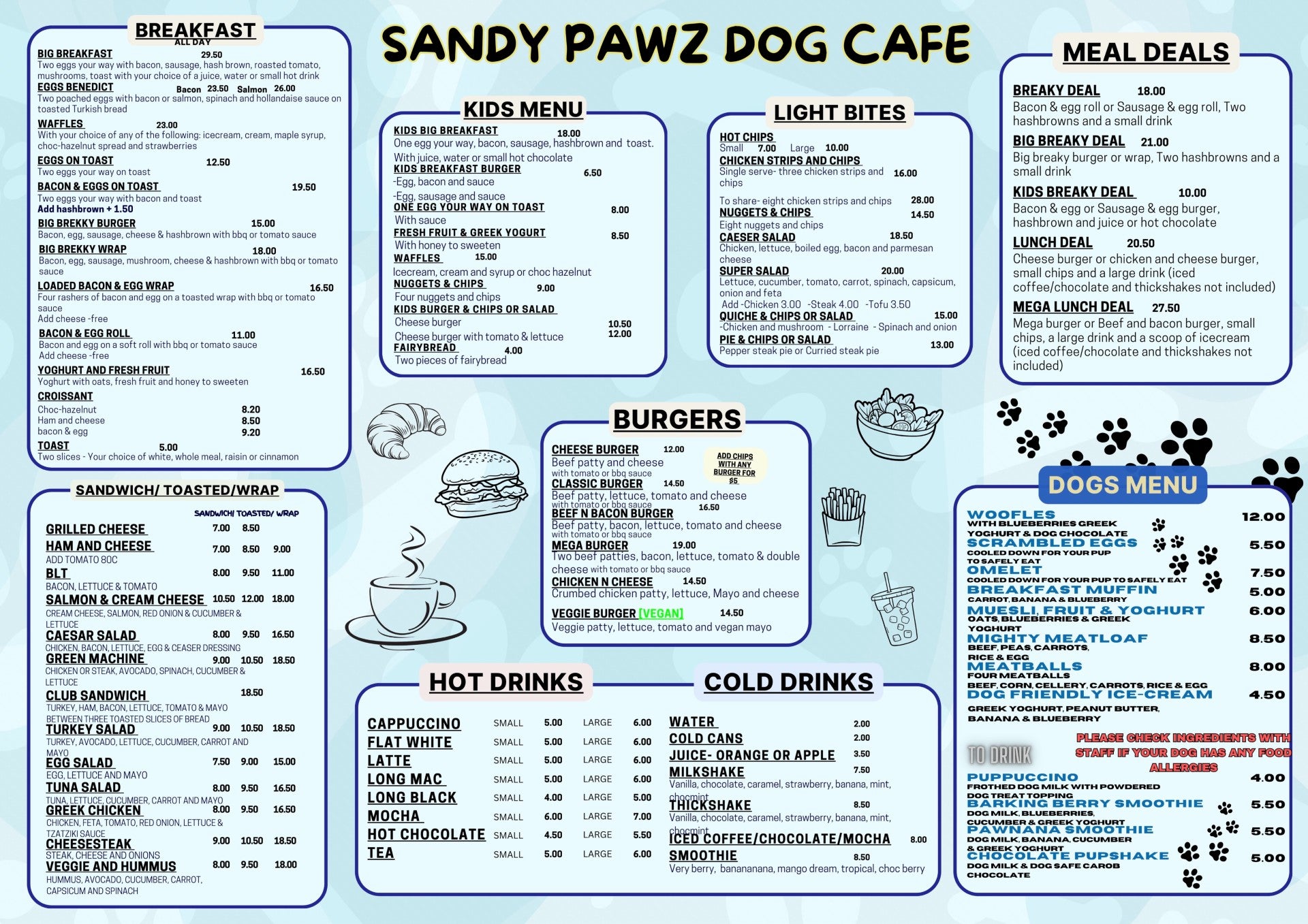 Yes! 🐶🍽 At Sandy Pawz Dog Café, we provide a variety of dog-safe meals and treats so your furry friend can enjoy a delicious snack alongside you. Our Dog Menu includes options like: